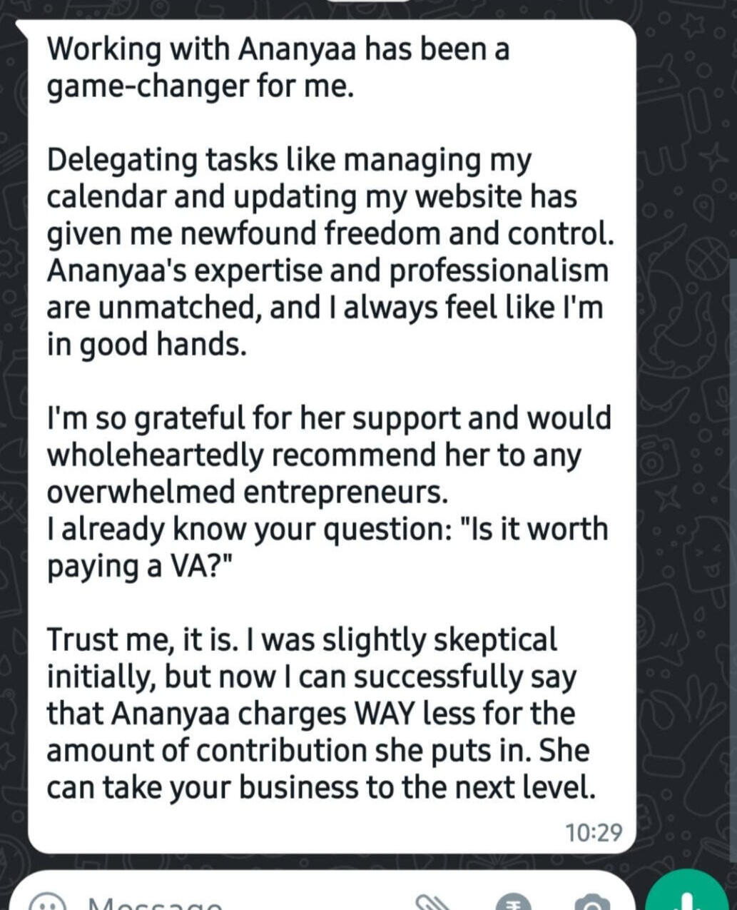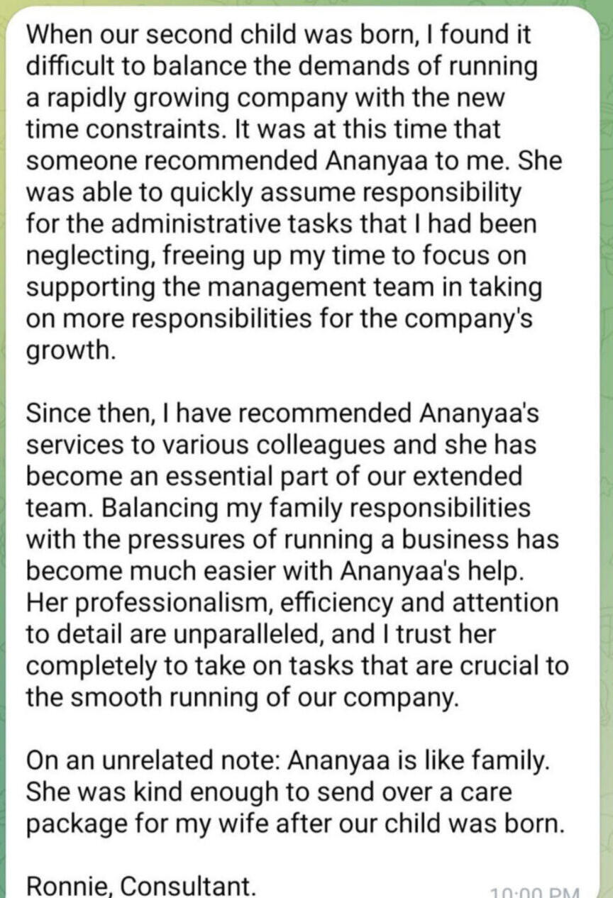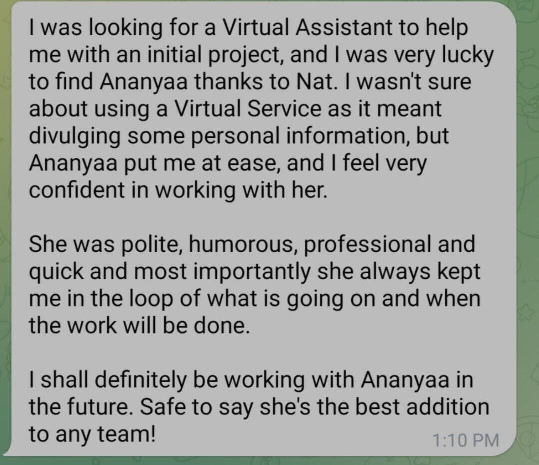 As a corporate junkie transitioning into an entrepreneur, I knew my expanding business needed administrative support, but hiring a full-time assistant wasn't ideal.I'd been used to a PA at my 9-5 and I knew I needed that kind of support, one I was used to for over 12 years.Just then, I came across Ananyaa.She's been a lifesaver, handling tasks like scheduling and inbox management flawlessly.With Ananyaa's assistance, my business now exudes a more professional image, impressing clients and boosting their satisfaction.I must say, Ananyaa truly impresses me. Her professionalism and eloquence set her apart from the other virtual assistants I interviewed. She handles administrative tasks with a keen eye for perfection, and her polite demeanor makes working with her a pleasure.Big cheers to Natalie for introducing us too!Compared to others, she stands head and shoulders above in terms of the level of support she provides. I'm grateful to have her on my team.I'm truly grateful for her contributions to my success.